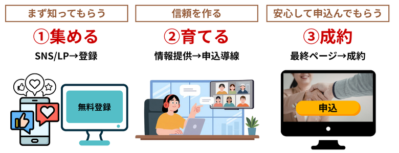 この基本構成で、「集客 → 無料登録 → 申込」までを一通り回せる状態を作ります。